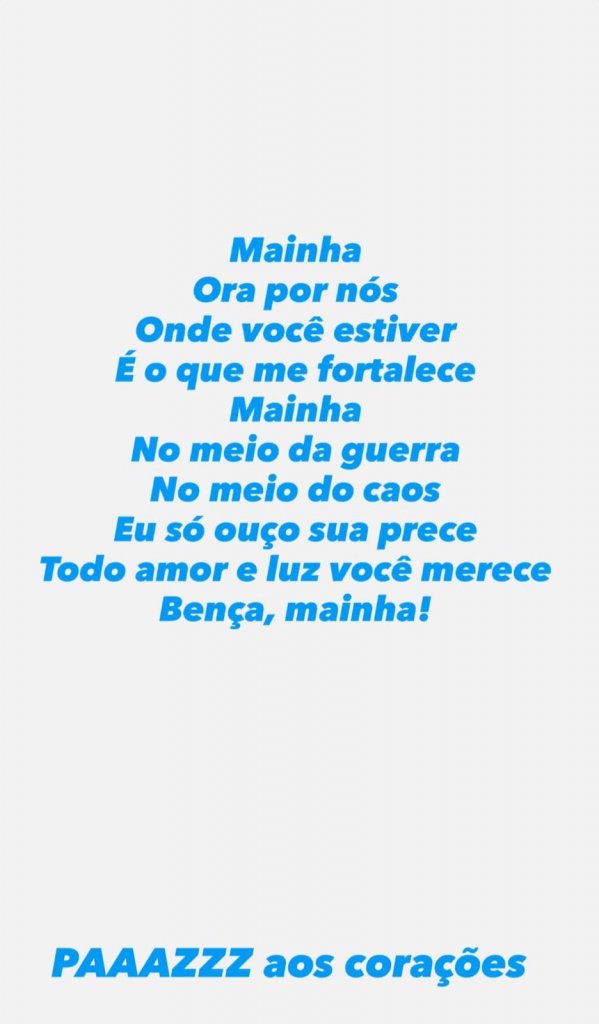 Nos stories do Instagram, o vocalista compartilhou uma homenagem à sua "mainha", pedindo proteção a ela.