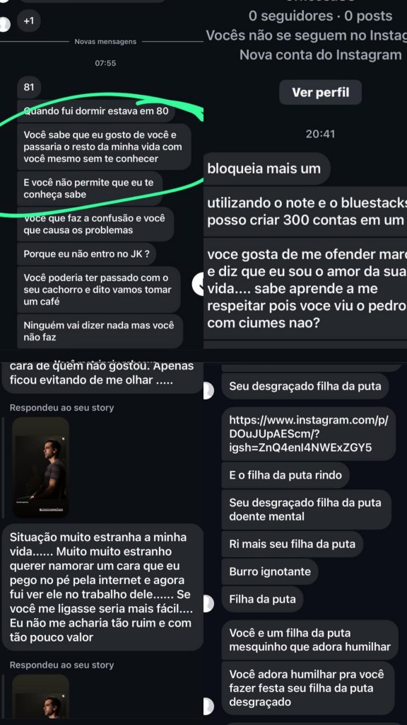 Após o primeiro post falando sobre o caso da sua colega de trabalho, Pitombo expôs alguns prints com mensagens que recebeu no último ano. Alterando o humor, o perseguidor diz que ama o ator, que o odeia e traz falas de teor sexual e diversos xingamentos.