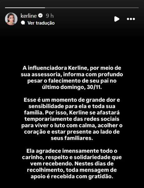 Nesta segunda-feira (1), a assessoria de Kerline Cardoso utilizou as redes sociais da influenciadora para anunciar o falecimento do pai dela. Além disso, o comunicado revelou que Kerline ficará afastada das redes sociais durante o período de luto.