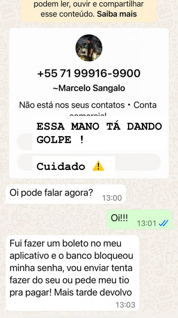 Na conversa, é possível notar o indivíduo pedindo dinheiro a um primo de Marcelo. “Oi, pode falar agora? Fui fazer um boleto no meu aplicativo e o banco bloqueou minha senha, vou enviar e tenta fazer do seu ou pede a meu tio pra pagar! Mais tarde devolvo”, escreveu o criminoso.