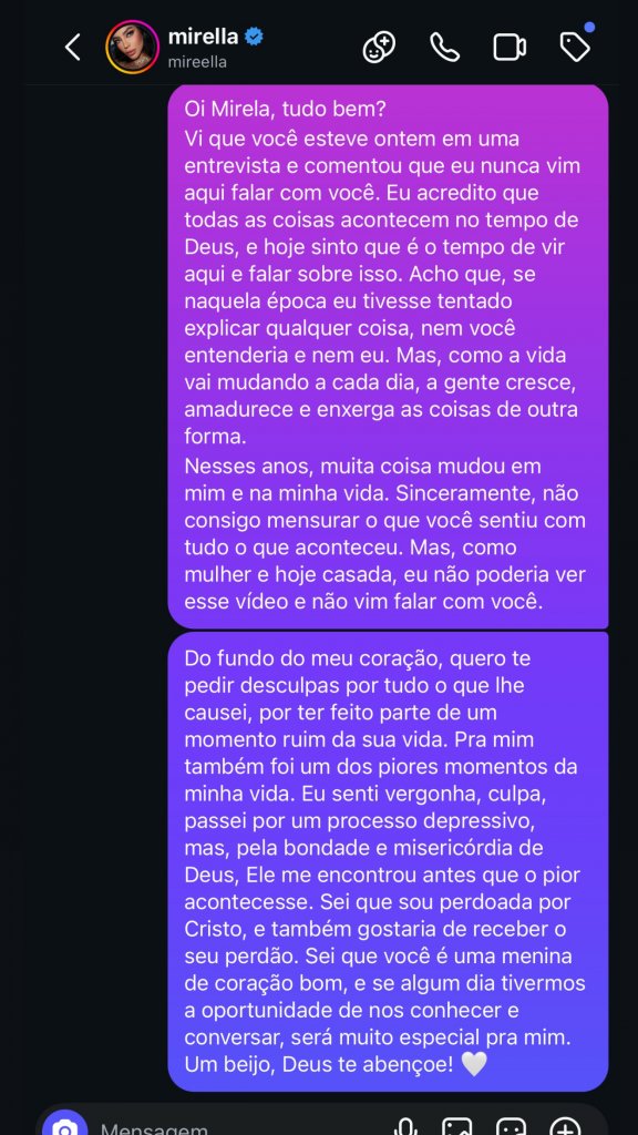"Eu acredito que todas as coisas acontecem no tempo de Deus, e hoje sinto que é o tempo de vir aqui e falar sobre isso. Acho que, se naquela época eu tivesse tentado explicar qualquer coisa, nem você entenderia e nem eu. Mas, como a vida vai mudando a cada dia, a gente cresce, amadurece e enxerga as coisas de outra forma.", diz um trecho da mensagem.