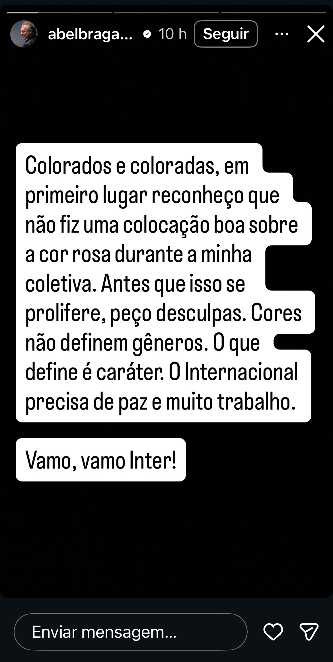 "Colorados e coloradas, em primeiro lugar, reconheço que não fiz uma colocação boa sobre a cor rosa durante a minha coletiva. Antes que isso se prolifere, peço desculpas. Cores não definem gêneros. O que define é caráter. O Internacional precisa de paz e muito trabalho[...] Vamo, vamo Inter!"